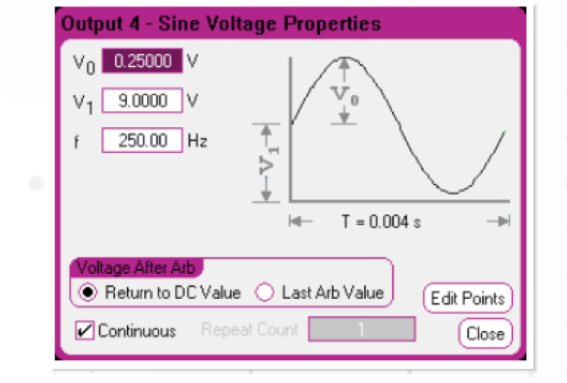 有多种方式可以创建包含纹波的输入。一种方式是利用函数发生器创建正弦波,然后将该信号与电源的输出混频。某些电源有模拟输入,允许您将函数发生器提供的外部信号添加到直流输出中。创建纹波的另一种方式是,使用具有内置函数发生器的电源,比如 Keysight N6705C 直流电源分析仪。