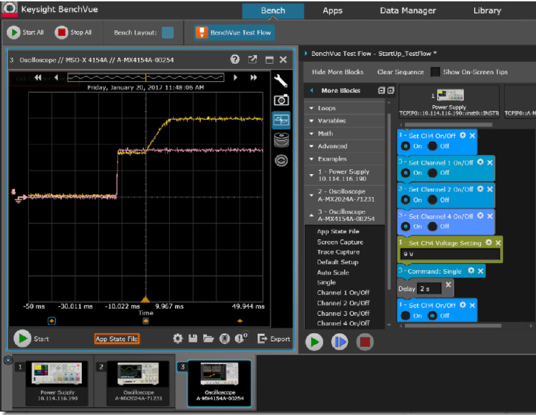图 3.3 显示了使用 Keysight N6705C 功率分析仪进行开启顺序测试的简单示例。通过为每路输出设置不同的开启时延,准确控制开启时序。