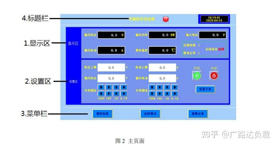 2) 设置区:电压、电流参数设置;参数设置下发及开机/关机控制按钮。