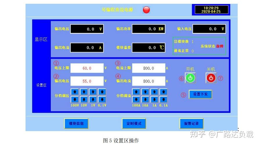 设置区组成部分:①电压上限,②输出电压,③电流上限,④输出电流,⑤设置下发,⑥开机,⑦关机;