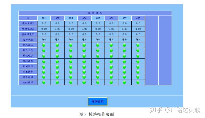 2. 模块信息页面 点击主页面菜单栏“模块信息”按钮,进入模块信息页。该页实时显示各个并机模块的运行状态和各告警信息(有告警:红色;无告警:绿色)。如图所示(图 3 模块操作页面):