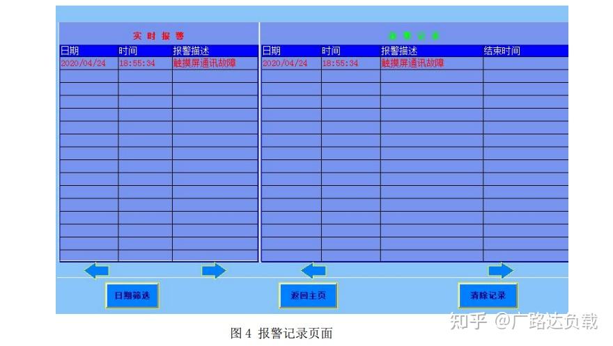 3. 故障操作页面 点击主页面菜单栏“报警记录”按钮,进入报警记录页。该页面内有实时显示故障信息以及历史故障信息。如图所示(图4 报警记录页面):