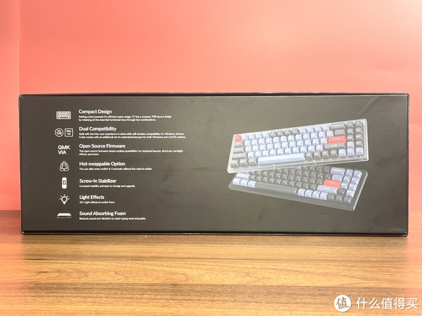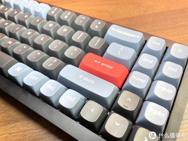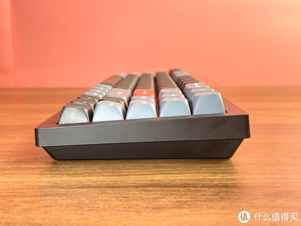 在外观设计上,Keychron V7采用全配列72键布局,整体大小比较小巧,配色方面更多的是沉稳,黑蓝配色的键帽和谐又低调,红色的esc和enter键在沉稳中增添了靓丽的成分,非常符合我这种中年的码子工人使用