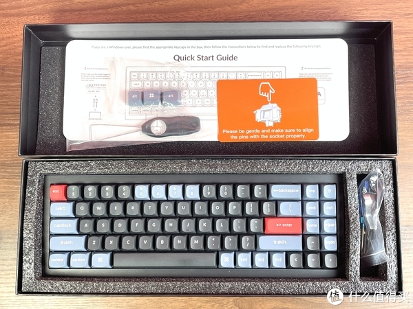 盒子整体上比较紧凑,除了键盘倒模之外,侧面的开窗里就是相关的配件和数据线。表面则随键盘赠送了一份说明书和一张轴体安装示意图,简单明了。