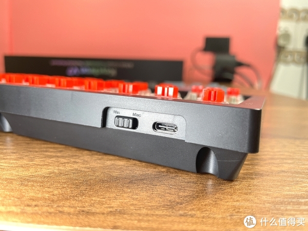 在键盘左上角,有一个Win/Mac切换按钮和C口数据线插口,一键切换。
