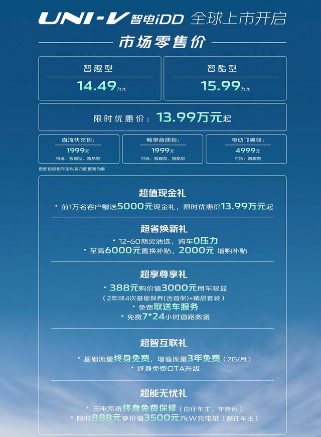 2月24日,长安UNI-V(配置|询价)智电iDD与UNI-K(配置|询价)智电iDD正式上市,其中前者推出智趣型和智酷型两款车型,售价分别为14.49万元和15.99万元,同时前1万名用户还可享受5000现金礼,等于实际为13.99万起。后者推出智享型、智趣型、智领型、智酷型共四款车型,售价依次为18.79万元、19.49万元、20.79万元、21.59万元。