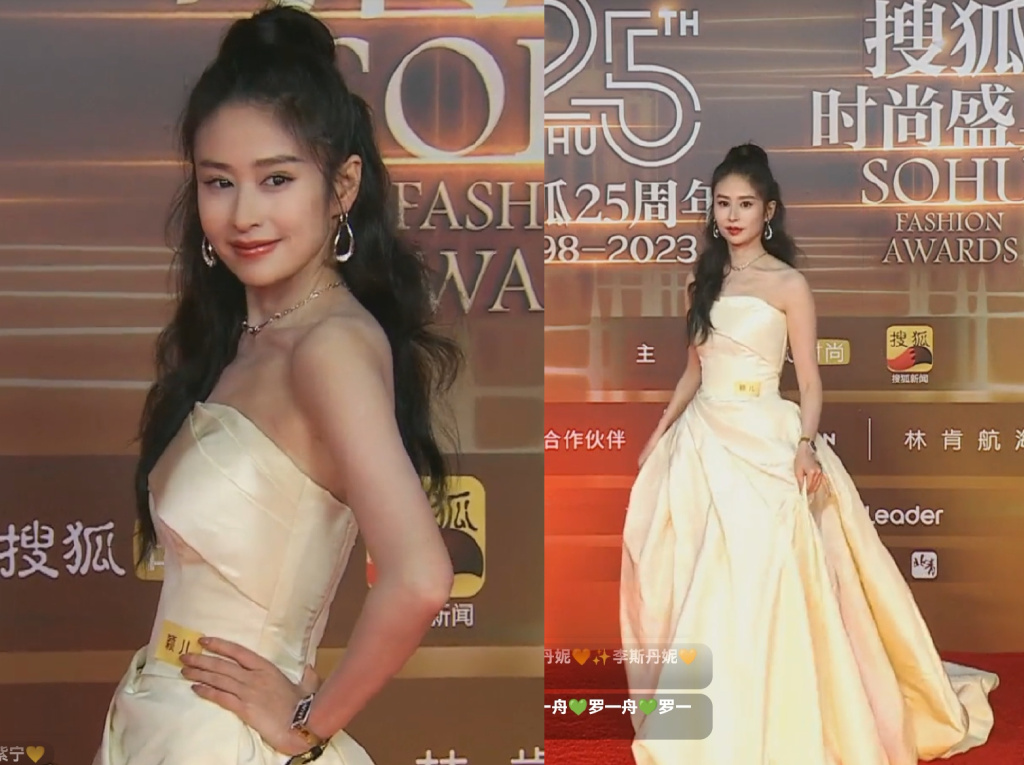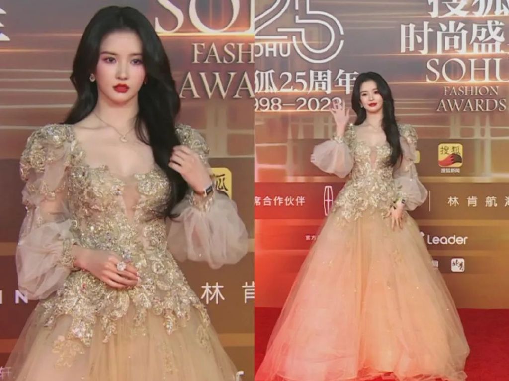 刘些宁的裙子很华丽,配上她较高的颜值和红唇、卷发,很有欧洲宫廷公主的感觉。