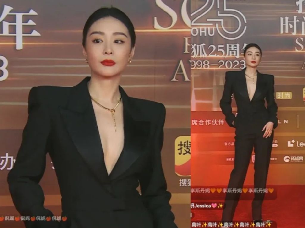 凭电视剧《狂飙》爆红的高叶,亮相的时候那强大的气场瞬间让人梦回大嫂这个角色,感觉她不是来走红毯的,而是来谈收购的。造型团队给她选了利落的盘发和深V西装,配上粗眉和红唇,很符合她大女人的形象,视觉冲击力很强。