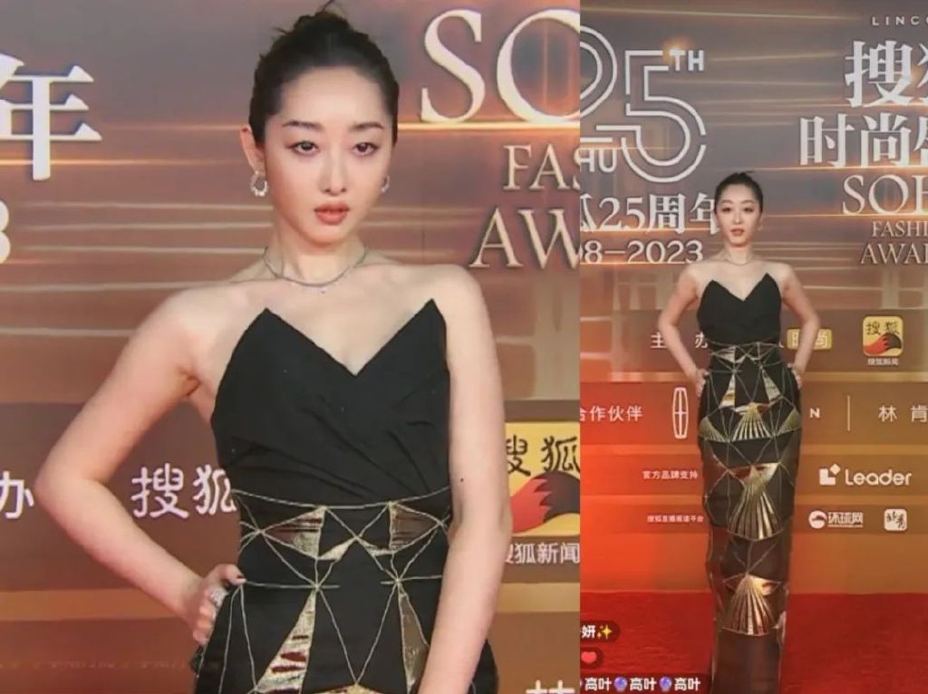 蒋梦婕踩着一双恨天高,穿了一条黑金色长裙亮相红毯,裙子是好看的,但她乖乖女的长相和气质似乎没能hold住这种风格。