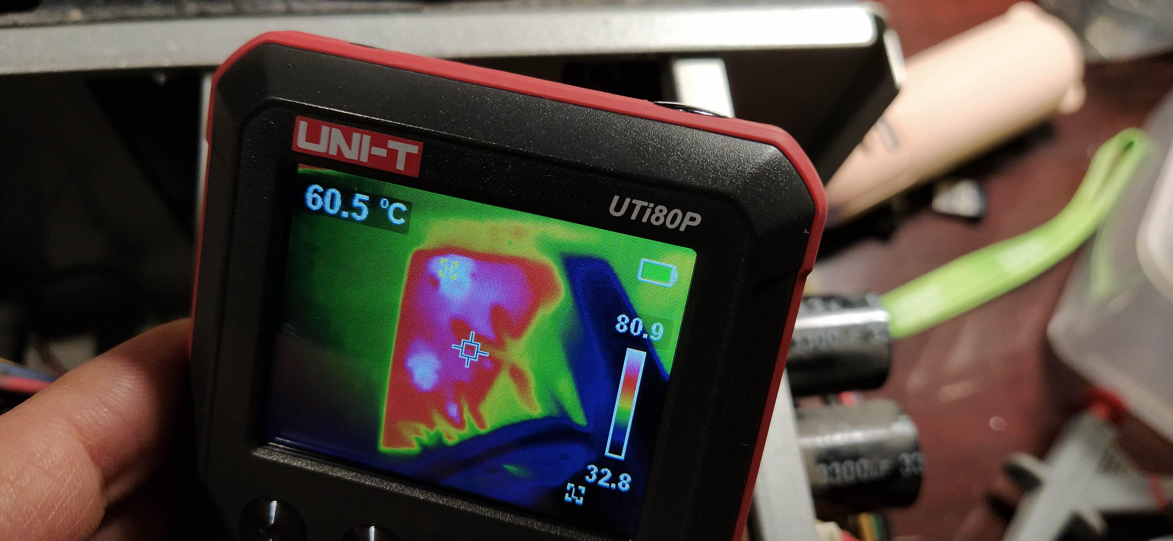 晚上在路上空闲的时候回想这个问题,觉得不可能出现这样的结果,回到家重新开盖,接上负载输出3A的时候,R149依然没有异常发热。在R149两端接好示波表,监测电压,开机的时候,奇怪的事情发生了,电阻压降又达到30伏,异常发热。测了从输出通道的对应电阻3A输出的时候压降是4V。再次把仪表接在R149两端,3A输出的时候也是4V,见鬼了!这时候撇了一眼旁边开着的热成像仪,发现居然有一个100多度的热点。找过去发现居然是主功率管的接线柱。