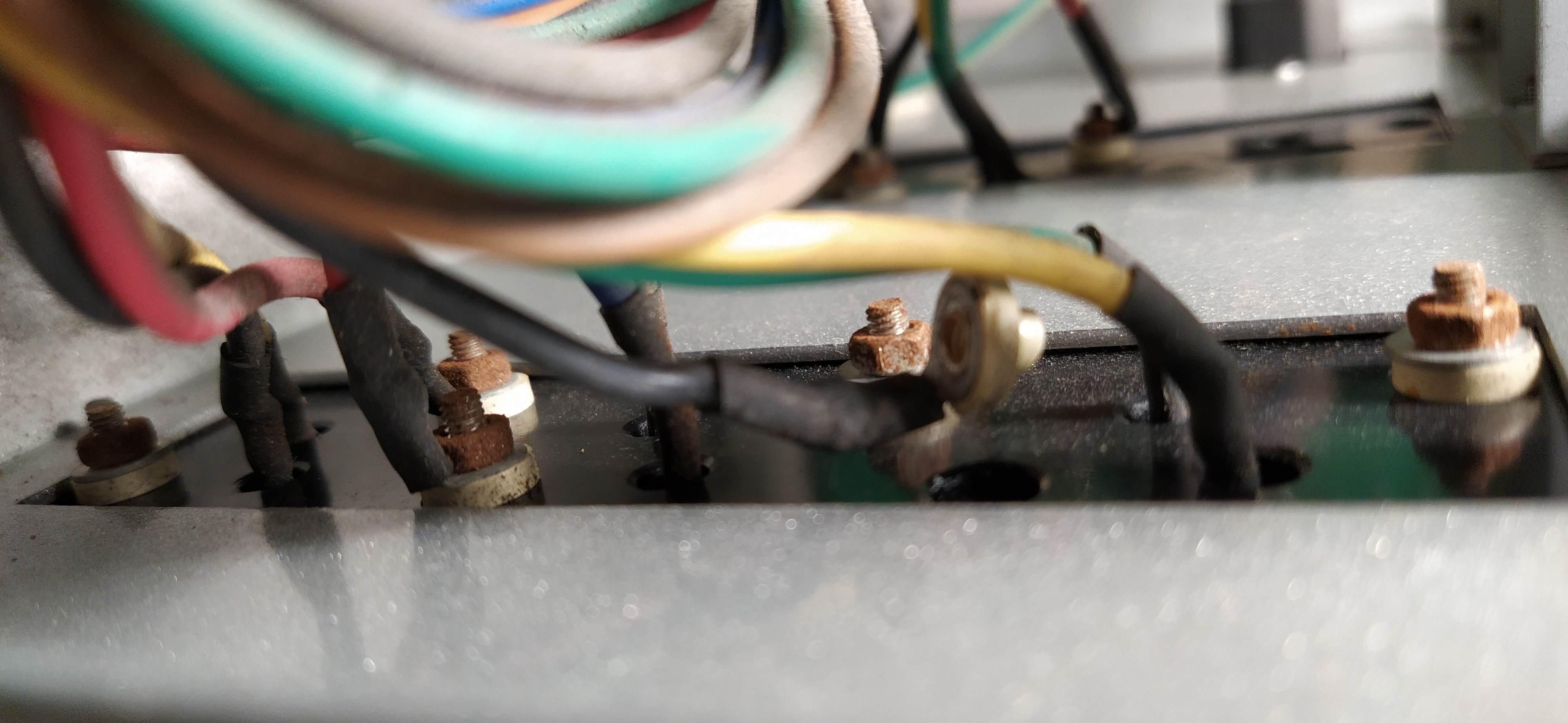 摇了一下发现已经很松了,还生了锈。原来是功率管的接线柱接触电阻过大,限制了输出电流。导致驱动及进入饱和状态,电源电压全部降在R149上造成严重发热。打开功率管的盖子。更换了接线柱,上紧所有螺丝。