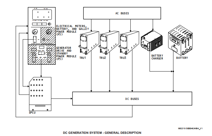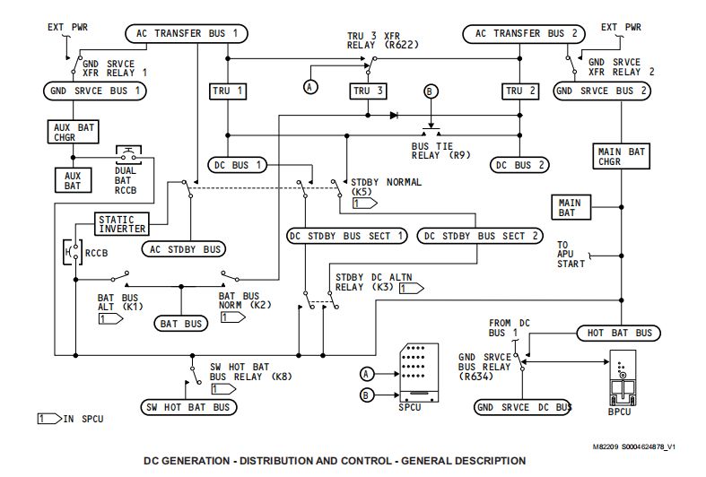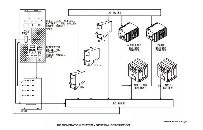 SPCU、电瓶电门、备用电瓶电门给直流系统提供基本的控制,其中电瓶电门、备用电瓶电门为直流系统的某些汇流条提供人工控制;SPCU为直流汇流条提供自动控制和保护,它使用来自驾驶舱的输入和系统监控来控制直流电源供应和分配。直流电源分配系统在电源分配面板PDPs和SPCU中。