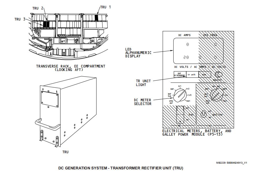 一般情况下变压整流器是直流电源系统的主要来源,变压整流器得到115V交流电将其转化为28V直流电。当飞机有冷却气流时每一个TRU能提供近75安培的电流,三个TRU并列连接彼此备份。TRU1从交流转换汇流条1得电,其输出直接给直流汇流条1;TRU2从交流转换汇流条2得电,其输出直接给直流汇流条2;TRU3通常从交流转换汇流条2得电,当TRU3无法从交流转换汇流条2得电时R622被激励,此时TRU3从交流转换汇流条1得到备用电源。TRU3的主要作用是给电瓶汇流条供电。