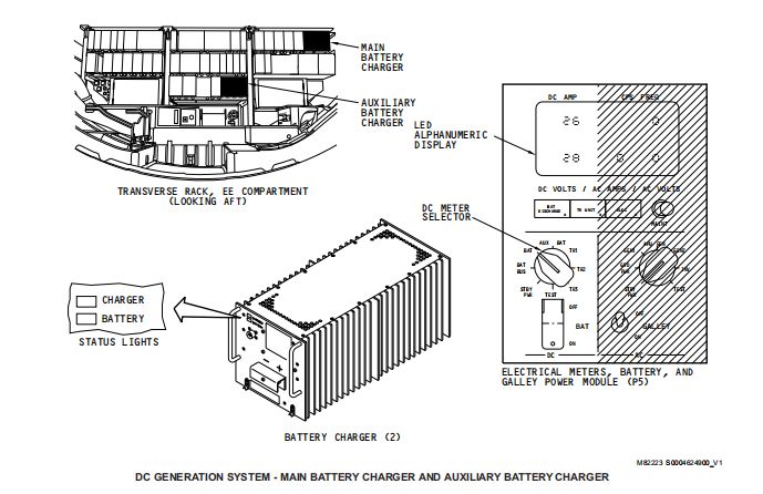 在变压整流模式下,主电瓶充电机提供直流恒压给热电瓶汇流条和转换热电瓶汇流条。主电瓶同时得到涓涓细流来保持其处于最大的充电量。在两种模式中的任一模式下,辅助电瓶充电机都不会为直流汇流条提供电源。然而当辅助电瓶充电机在变压整流模式下,辅助电瓶可以得到小电流充电。每个电瓶充电机获得三相115交流电,将其转换成直流电。通常,每一个电瓶充电机在变压整流模式,在这种模式下,电瓶充电机提供一个恒定的电压以及高达65A的电流输出。当电瓶电压低于23V时,电瓶充电机进入充电模式。在这种模式下,充电机提供恒定的电流,输出电压是变化的。在充电期间,电瓶电压上升直到电压达到过渡电压。在充电伊始,电瓶充电机逻辑使用电瓶的温度来计算过渡电压,然后计算过充阶段的时长。过充阶段之后,电瓶充电机进入变压整流模式,输出27.5V的恒定直流电压。电瓶在这种模式下,接收到涓涓细流。当以下任一情况发生时,电瓶充电机再次进入充电模式:电瓶充电机的输入电源断开超过1S