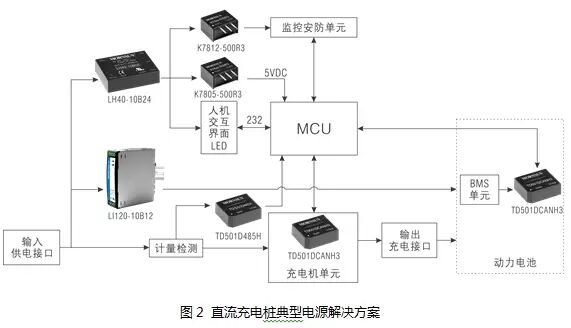 在直流充电桩工作时,辅助电源给主控单元、显示模块、保护控制单元、信号采集单元及刷卡模块等控制系统进行供电。另外,在动力电池充电过程中,辅助电源给BMS系统供电,由BMS系统实时监控动力电池的状态。