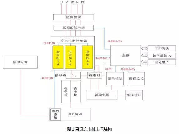 直流充电桩采用三相四线制供电,可以提供足够大的功率,输出的电压和电流调整范围大(适用于乘用车和大巴车的电压需求),可以实现快充。直流充电桩与交流充电桩的计量和通信及扩展计费功能类似,其电气结构图如下图1所示: