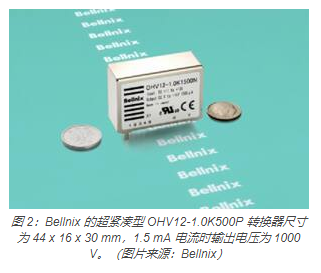 有些应用要求 DC/DC 转换器外形紧凑,以便节省空间、简化安装。对于这类应用,Bellnix 专门设计了 OHV 系列 1.5W 中高压 DC/DC 转换器。相比开发时可用的模块,所需的安装面积减少了近 60%。OHV12-1.0K1500P 是系统级封装 (SiP) 器件,尺寸为 44 x 16 x 30 mm,1.5 mA 电流时输出电压为 1000 V(图 2)。此外,Bellnix 的这个系列还针对纹波噪声进行了精心设计,峰峰值 (P-P) 可低至 5 mV。