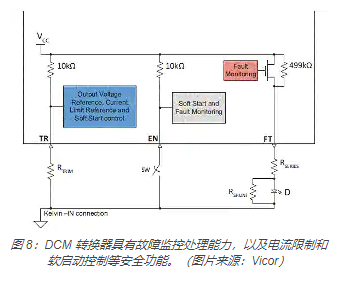 DCM2322T50T3160T60 等 DC/DC 转换器模块 (DCM) 单元充分利用了 Vicor 的 ChiP 封装技术在散热和功率密度方面的优势,使内部产生的热量均匀分散至封装表面。ChiP 技术还使 DCM 转换器具有极低的上、下侧热阻抗,从而提供灵活的热管理选项。高效的热分配使 DCM 单元能将各种非稳压电源连接至负载点。此外,还提供输入和输出过压故障保护及其他故障处理机制,以便在检测到故障时关闭转换器(图 8)。