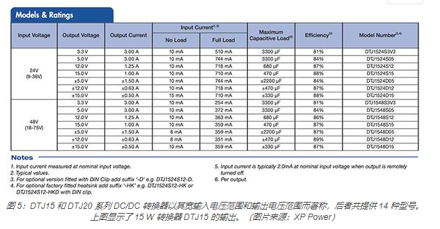 除了易于安装外,这些电源转换器的一个重要特性是可涵盖较宽的直流电压输入范围:9 V 至 36 V 和 18 V 至 75 V。这些转换器可使用多个标称电池电压和车辆电源等各种输入源,因而适用于众多工业、商业和通信应用。DTJ15 和 DTJ20 系列 DC/DC 控制器共提供了 14 种型号,其中单输出器件可提供 3.3 V、5.0 V、12.0 V 和 15.0 V 的电压,双输出器件可提供 ±5.0 V、±12.0 V 和 ±15.0 V 的电压(图 5)。