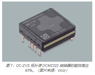 Vicor 的 DCM2322 是隔离式 DC/DC 转换器系列,可在 9 V 至 50 V 的非稳压直流输入下工作,产生 28 V 的隔离输出(图 7)。它基于该公司的双钳位零电压开关 (DC-ZVS) 拓扑,有助于在整个输入电压范围内提供 93% 的高能效。