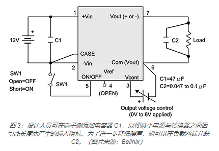 该系列输入电压范围为 11 V 至 13 V,输入电流为 0.28 A。输出电压范围包括 0 至 +/-1000 V(0 至 1.5 mA)、0 至 +/-1500 V(0 至 1.0 mA)和 0 至 +/-2000 V(0 至 0.7 mA),具体取决于器件型号。仪器仪表等应用中,这些器件低至 5 mVP-P 的纹波噪声相当重要,因为在这类应用中,高压电源的任何不稳定都会产生噪声并影响设备的精度。Bellnix 自主开发的电路技术能将噪声水平降至最低。虽然这些自主式器件无需任何外部元器件,但是设计人员仍可添加元器件以进一步降低噪声,减小输入阻抗(图 3)。