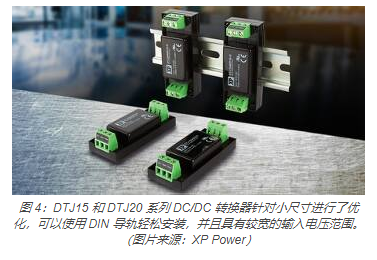 与 nHV 系列一样,XP Power 的 DTJ15 和 DTJ20 系列 15 W 和 20 W DC/DC 转换器也采用小型封装,以便于安装和高能效运行,不过有一点不同:这两个系列可安装在机架或 DIN 导轨上,通过螺纹端子连接(图 4)。