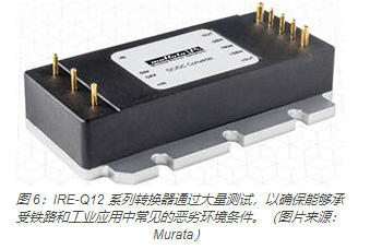 在铁路、工业和运输应用中,电源系统设计对瞬态阶跃负载的快速建立时间有一定要求。而考虑到输入和输出电压振荡等其他瞬态事件,自保护功能对于 DC/DC 转换器的安全可靠运行就显得至关重要。在电流限制(也称为功率限制)模式下,输出电流一旦增至约额定值的 130%,DC/DC 转换器就会进入电流限制模式,致使输出电压开始成比例下降,以保持恒定的耗散功率。如果环境条件导致 DC/DC 转换器的温度升至设计工作温度以上,则精密温度传感器将关闭器件电源。一旦内部温度降至温度传感器阈值以下,DC/DC 转换器就会自启动。Murata 的 IRE-Q12 系列隔离式 DC/DC 转换器具有自保护功能,可确保不会因较高的容性负载产生不利影响(图6)。例如,IRE-12/10-Q12PF-C 集成了所有相关的自保护功能,同时满足 EN50155 要求,能在掉电和瞬态条件下促进标称电池电压的产生。