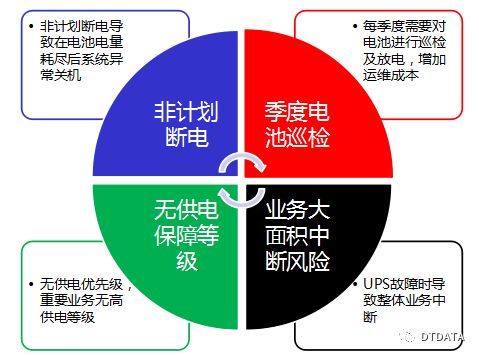 未来的数据中心趋向于绿色、节能、标准化、智能化,更多的数据中心愿意采用绿色能源、模块化通道封闭、空调节能技术、自然冷却、高压直流供电、软件定义等技术降低成本,提升竞争力,而作为复杂的供配电系统,数据中心传统供电系统是存在诸多问题,如每季度需要对电池进行人工巡检,当一组电池中单颗电池故障时,往往需要整组更换;UPS系统需要扩容或者因故障需要更换时,因电力区域面积空间受限,扩容改造和系统割接难以实施;同时UPS系统单机容量也越来越大,内部控制系统也越来越复杂,维护难度也随之加大。