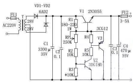 元器件选择:变压器T选用80W~100W,输入AC220V,输出双绕组AC28V。FU1选用1A,FU2选用3A~5A。VD1、VD2选用 6A02。RP选用1W左右普通电位器,阻值为250K~330K,C1选用3300µF/35V电解电容,C2、C3选用0.1µF独石电容,C4选用 470µF/35V电解电容。R1选用180~220Ω/0.1W~1W,R2、R4、R5选用10KΩ、1/8W。V1选用2N3055,V2选用 3DG180或2SC3953,V3选用3CG12或3CG80