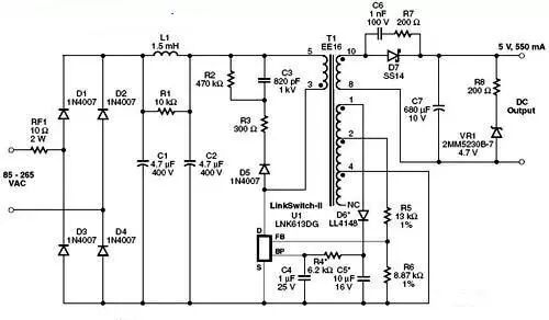 该设计采用了Power Integrations的LinkSwitch系列产品LNK613DG。这种设计非常适合手机或类似的USB充电器应用,包括手机电池充电器、USB 充电器或任何有恒压/恒流特性要求的应用。