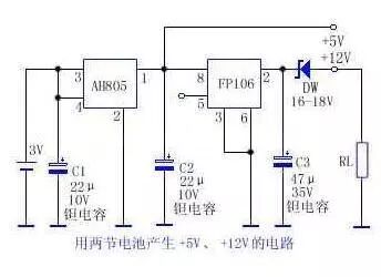 两节1.5V碱性电池输出的3V电压输入AH805,AH805输出+5V电压,其一路作5V输出,另一路输入FP106使其产生28~30V电压,经稳压管稳压后输出+12V电压。