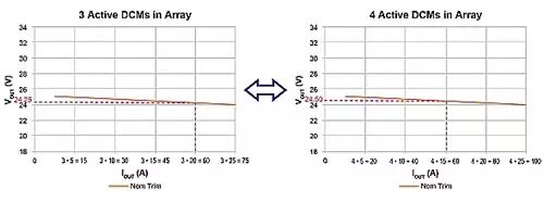 尽管如此,虽然这种负载线输出特性允许多个DCM输出直接进行并联,但是它们自身的误差放大器控制回路仍处于活动状态。如果所有的DCM对负载都有相同的外部(真正的)路径电阻,有相同的调节设定值,并且都处于相同温度,阵列中的DCM上的负载电流分布是完全相等的。因此,并联DCM的行为就像单个DCM,但是有更高的输出电流(图4)。