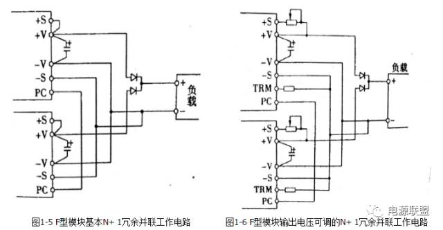 F型模块最基本的N+1冗余并联工作电路如图1-5所示,输出电压可调的N+1冗余并联工作电路如图1-6所示。