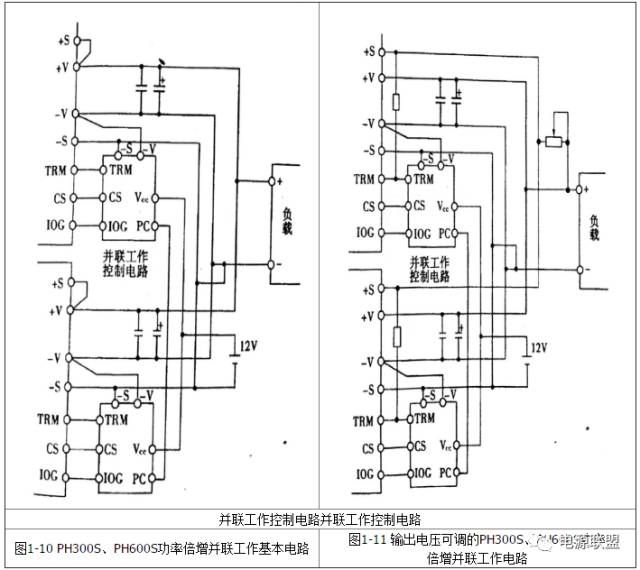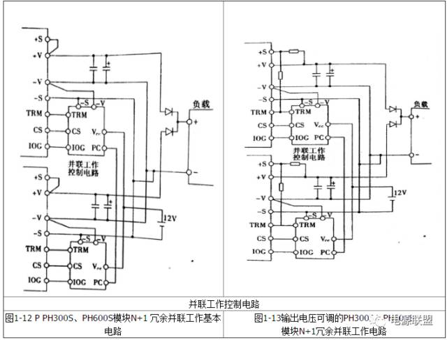 PH300S和PH600S模块并联工作控制电路如图1-8所示。PH300S和PH600S模块并联工作时,每只模块都接入并联控制电路后,输出电流较小的模块,输出电压将上升,负载电流增加,从而使各模块输出电流均等。(电源方案解决专家:华星电源)