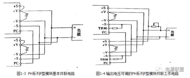 在实际应用中,当一只模块的输出功率不能满足负载的要求时,可通过多只模块并联、使输出功率倍增,也可通过各只模块并联,减小每只模块的输出功率,从而提高模块的工作可靠性。PH系列F型模块最基本的并联工作电路如图1-3所示。