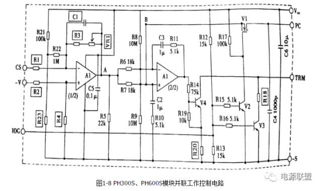 PH300S和PH600S模块并联工作时,各模块的电流取样脚CS应接到并联工作控制电路的CS脚。PH300S和PH600S模块CS脚与-V之间的负电压,与模块的输出电流成正比,如图1-9所示。该电压经并联工作控制电路中的运放AI(l/2)反相放大后,在A点输出3~5V电压。PFF300S和PH500S模块并联供电前,应先断开PC脚的连线,调整运放A1反馈回路中的电位器VR1,将A点电压调整在3~5V。(电源方案解决专家:华星电源)