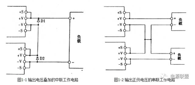 输出正、负电压的串联工作电路如图1-2所示,正电压负载和负电压负载完全隔离时,模块输出端不需要加旁路二极管。