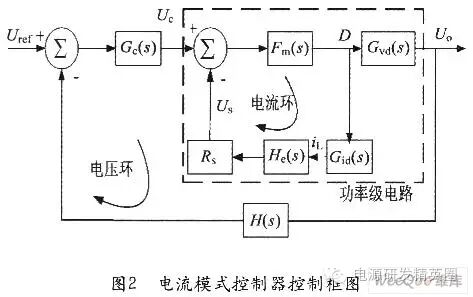 控制框图中Gvd(s)是功率级电路占空比控制端到输出电压的传递函数,Gid(S)为占空比控制端到电感电流的传递函数,Fm(s)为PWM调制器的增益函数,He(s)为电流模式控制的开环采样增益,Rs为电流采样电阻,Uref为基准参考电压。
