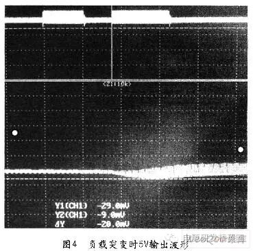 为测试所设计的开关电源的稳定性和动态响应性能,设计如下的实验:将负载由半载到满载突变和满载到半载突变(包括5V反馈负载突变),观察5V的输出波形,实验波形如图4所示。