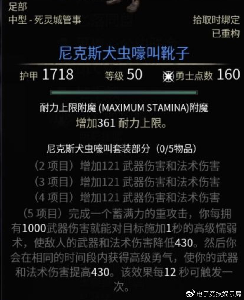 而“巴尔桑纳”地下城的套装则是“尼克斯犬虫的嚎叫”。可以看到满蓄力重攻击能够施加一个类似于“吸取”敌人属性的效果,增加自己的伤害,削弱敌人的伤害。比较适合大开大合、喜欢打头阵的朋友。尤其是在组队对战的时候,降低敌人武器和法术伤害的效果能给队友提供不错的输出空间。