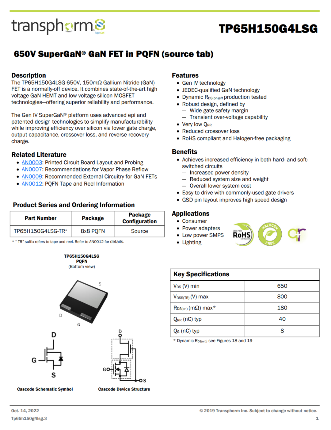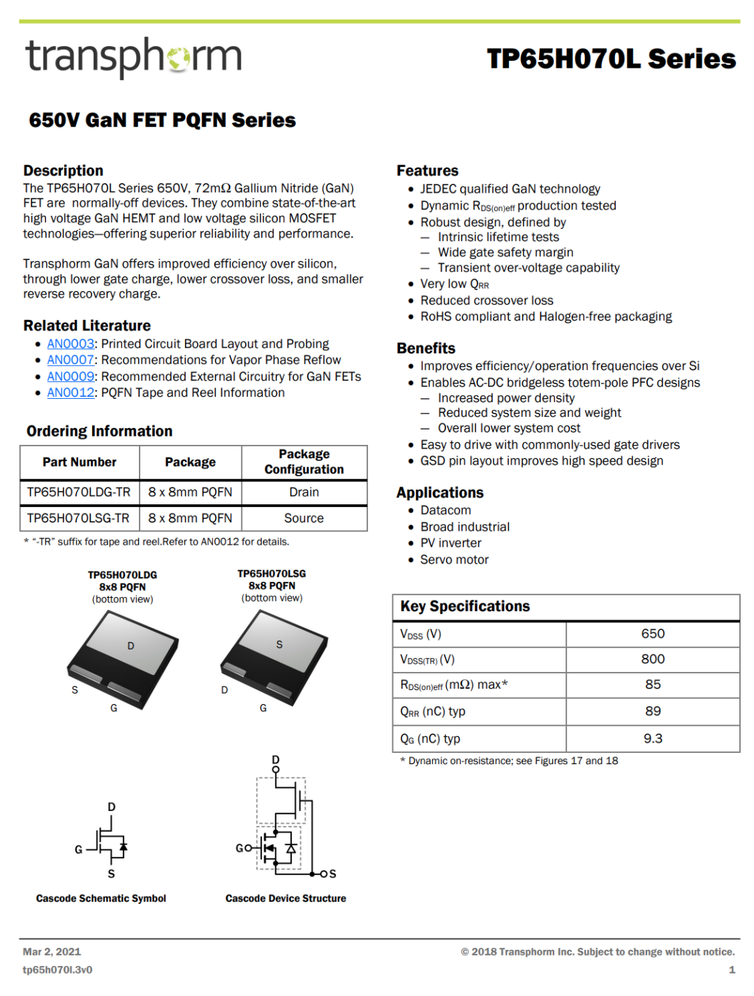 其中TH65H070L分为TP65H070LDG和TP65H070LSG两个型号,散热焊盘分别对应漏极和源极,方便大功率应用设计。可用于逆变器,马达驱动等工业应用。