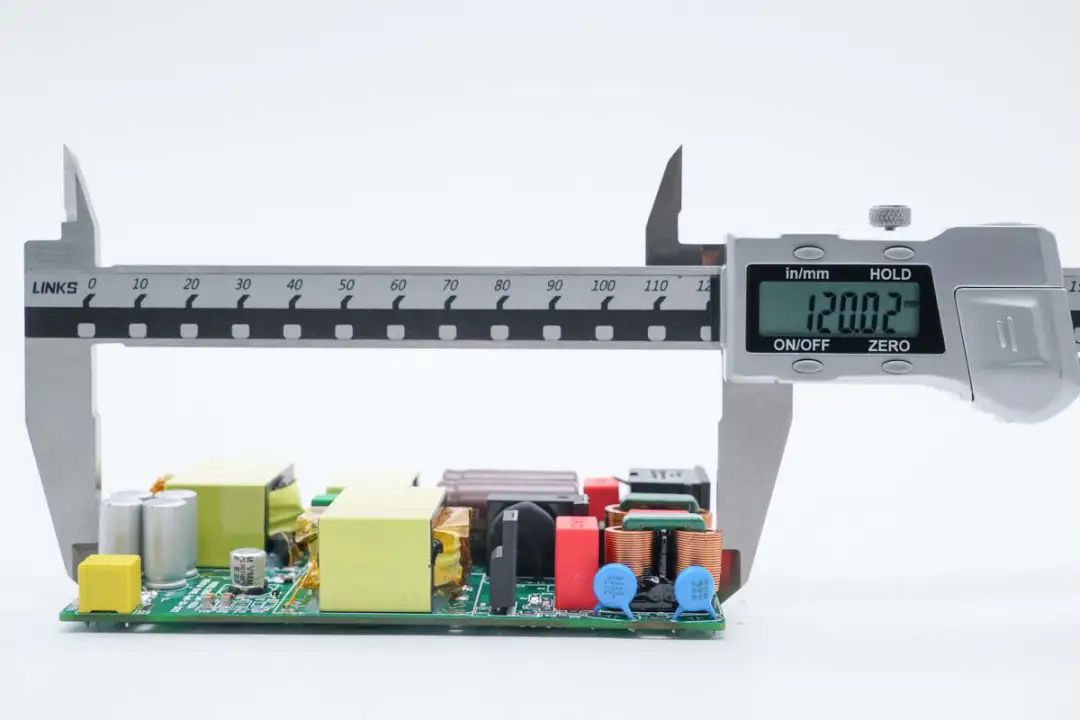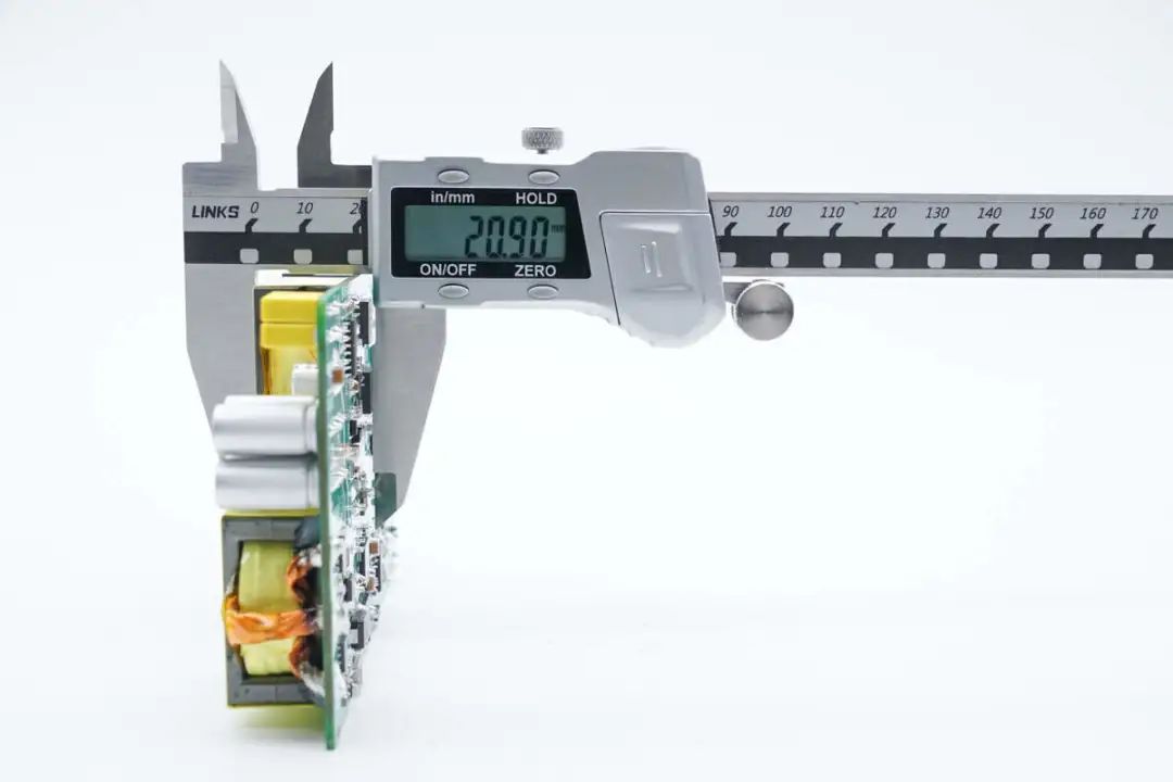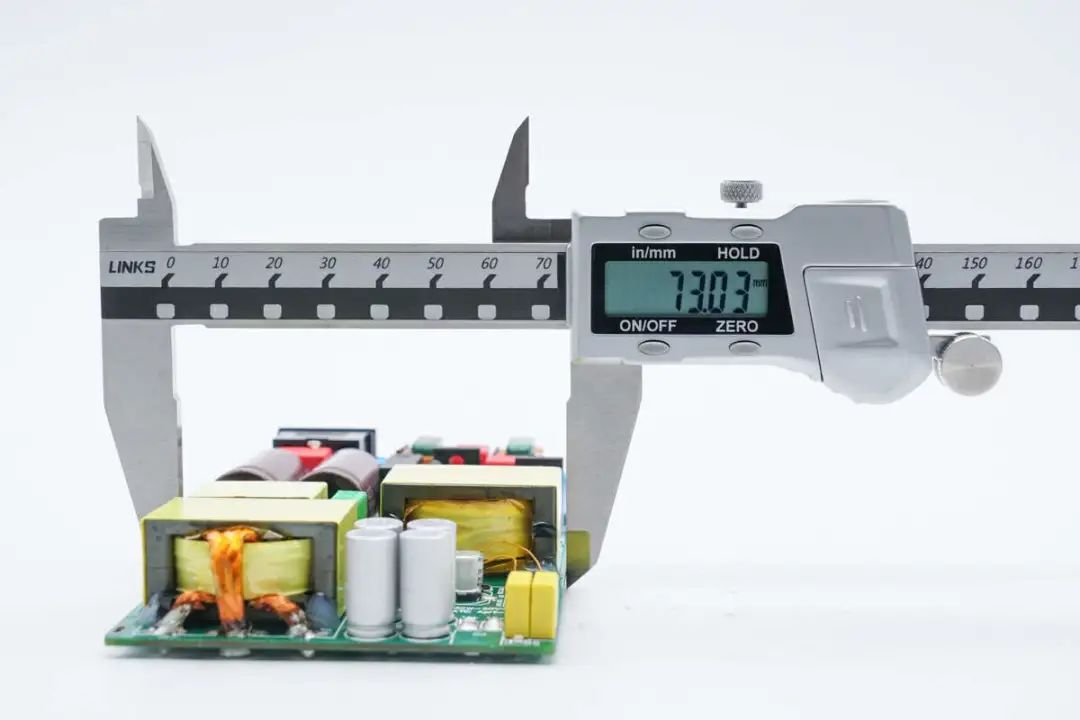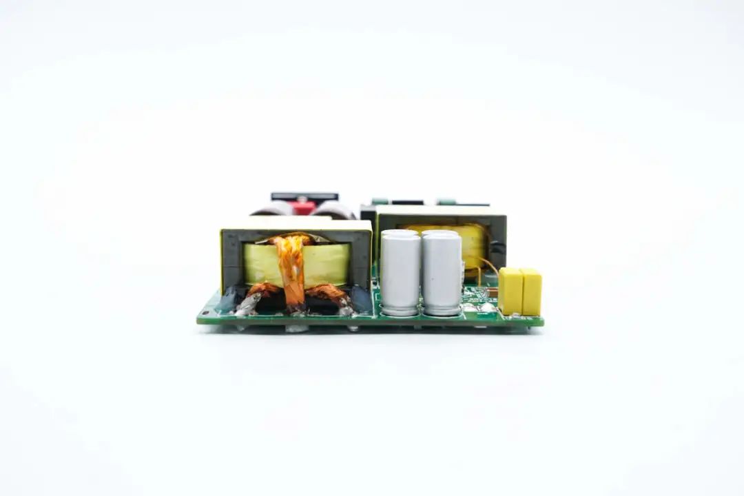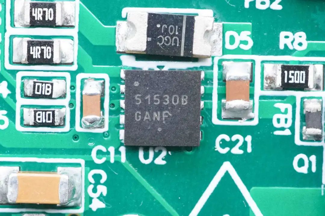 PCBA模块背面焊接整流桥,氮化镓开关管,两颗驱动器芯片,图腾柱PFC控制器,LLC控制器,同步整流控制器和两颗同步整流管。初次级之间焊接贴片Y电容和反馈光耦。