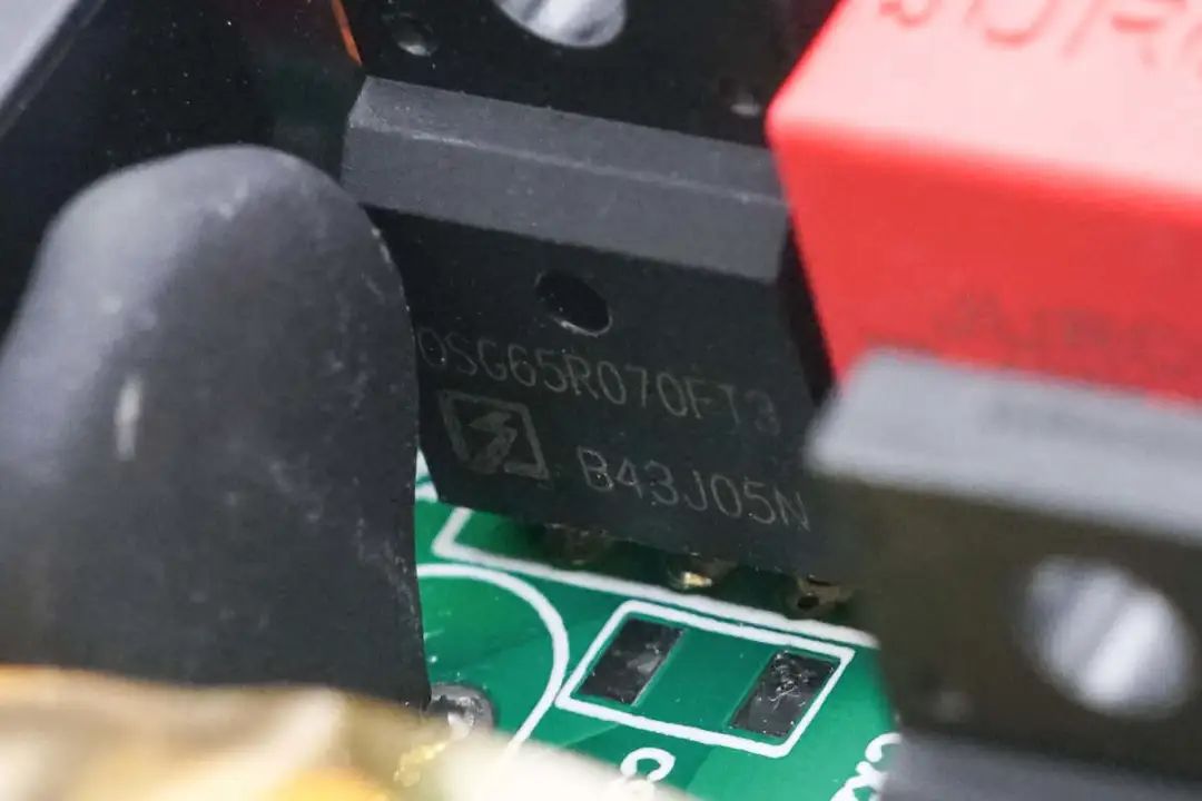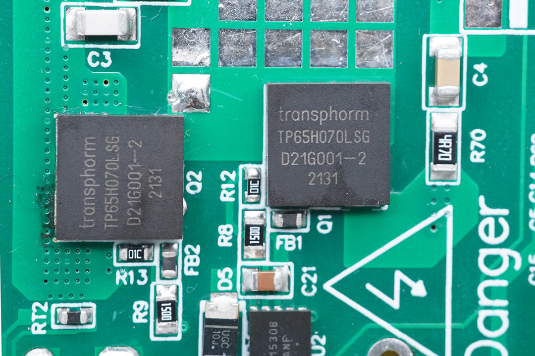 LLC半桥采用NCP13992控制器,搭配使用两颗TP65H150G4LSG氮化镓开关管。其中PFC电感,谐振电感和变压器均采用利兹线绕制,降低高频损耗。电源内部高压电解电容与输出固态电容全部来自永铭。小体积高性能的设计,转换效率高达96%,有效降低发热,助力缩小笔记本的外置电源,提升消费者的使用体验。
