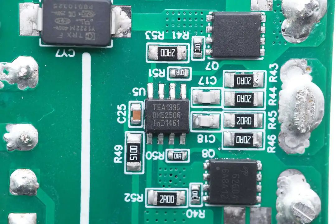 同步整流控制器来自NXP恩智浦,型号为TEA1995,其内置两个独立的同步整流驱动器用于LLC架构开关电源的同步整流,外围元件精简,支持38V工作电压,能够满足USB PD3.1的28V输出。