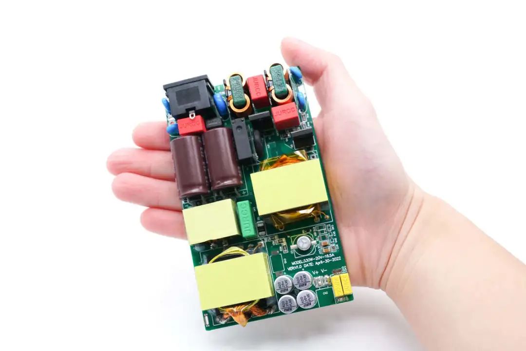 锐仕嘉330W电源适配器DEMO输入端采用梅花插口,可以接地避免用户触电。设计了两级EMI滤波电路,两颗高压滤波电解电容横置,板子正面器件之间留有空隙,实际量产可填充导热胶固定散热。