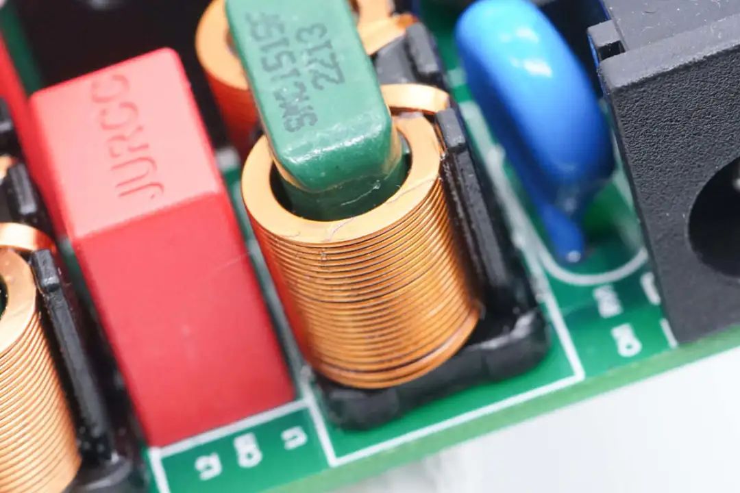 参考设计输入端一览,焊接Y电容,扁铜线共模电感,安规X2电容,压敏电阻和输入插座。