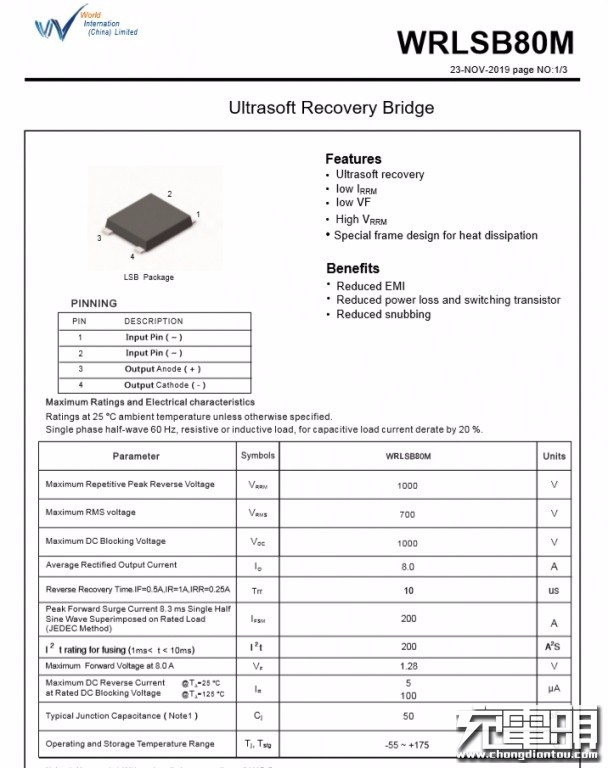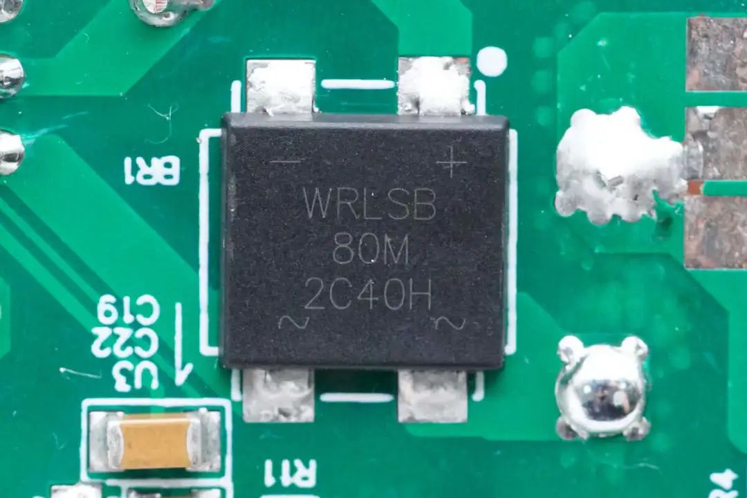 整流桥来自深圳市沃尔德实业有限公司,型号WRLSB80M,这颗软桥通过较软的恢复曲线,比较平滑的关断特性,可以降低二极管结电容达到非常少的谐波振荡产生的效果。选用的LSB封装,拥有良好的散热特性,帮助中大瓦数适配器提升可靠性,单颗可做60W+。