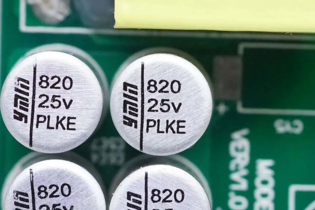输出滤波电容来自永铭,为NPL系列固态电容,820μF 25V,四颗并联。