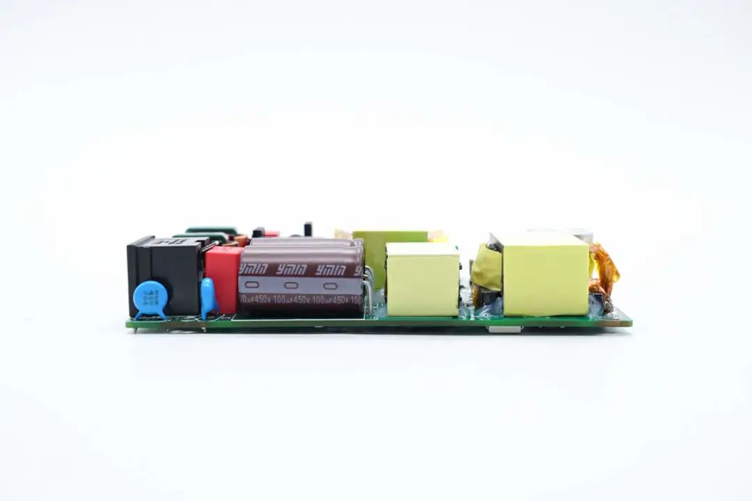 PCBA模块正面一览,右侧为交流输入端,焊接AC输入插座,压敏电阻,共模电感,安规X2电容等元件。依次焊接高压滤波电容,继电器,NTC热敏电阻。下方焊接PFC升压电感,上方焊接绿色谐振电容,谐振电感,左侧焊接变压器,输出滤波电容。