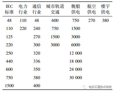 2.2 直流电压等级及供电标准直流供电的电压等级及序列关系到电网安全性、经济性、负荷适应性等关键问题,对电网的未来发展有重要影响。通信、交通、船舶和航空等特殊行业直流负荷较小,对供电可靠性要求高,且有电能存储的需求,因此较早地采用了直流供电系统,其中通信、船舶业采用的电压等级较多。各行业直流电压等级如图1所示。